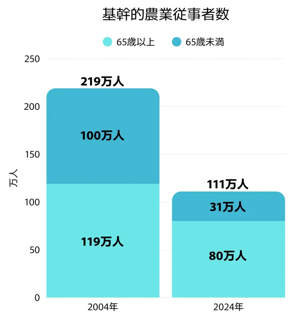 日本の基幹的農業従事者は2004年の219万人から、2024年には111万人へと半減。そのうち7割以上が65歳以上という現状で、農業の担い手不足と高齢化は深刻です。さらに、猛暑や異常気象の頻発により、安定的な農業生産は難しさを増しています。